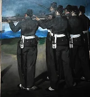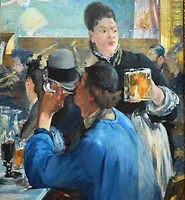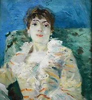 The painting is unusual in its composition - a close-up of symmetrically disposed figures - and in the bravura of its technique. The white dashes of paint indicating the dress of the left-hand figure are prominent. They contrast with the shadowed face, probably concealed by a veil, and the parasol shading the flowered hat.